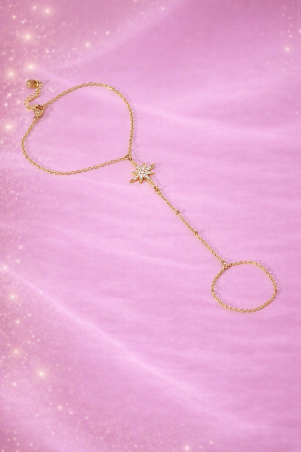 Reliant élégamment le poignet au doigt, ce modèle est orné d’une étoile scintillante sertie de strass, apportant une touche lumineuse et raffinée à votre style.
