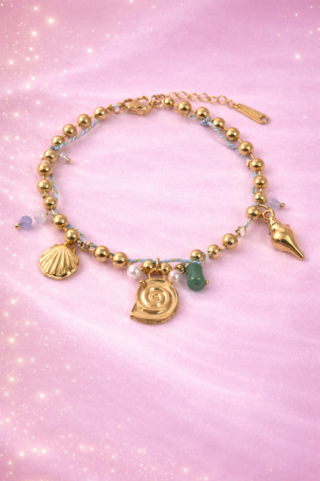 Apportez une touche d’élégance estivale à votre style avec ce bracelet doré orné de charms inspirés de l’océan. Composé de perles dorées, d’un coquillage, d’un escargot et de pierres délicatement colorées, ce bijou fantaisie évoque l’esprit marin et les vacances en bord de mer. Léger et raffiné, il s’adapte parfaitement à toutes vos tenues, du look décontracté au style chic.