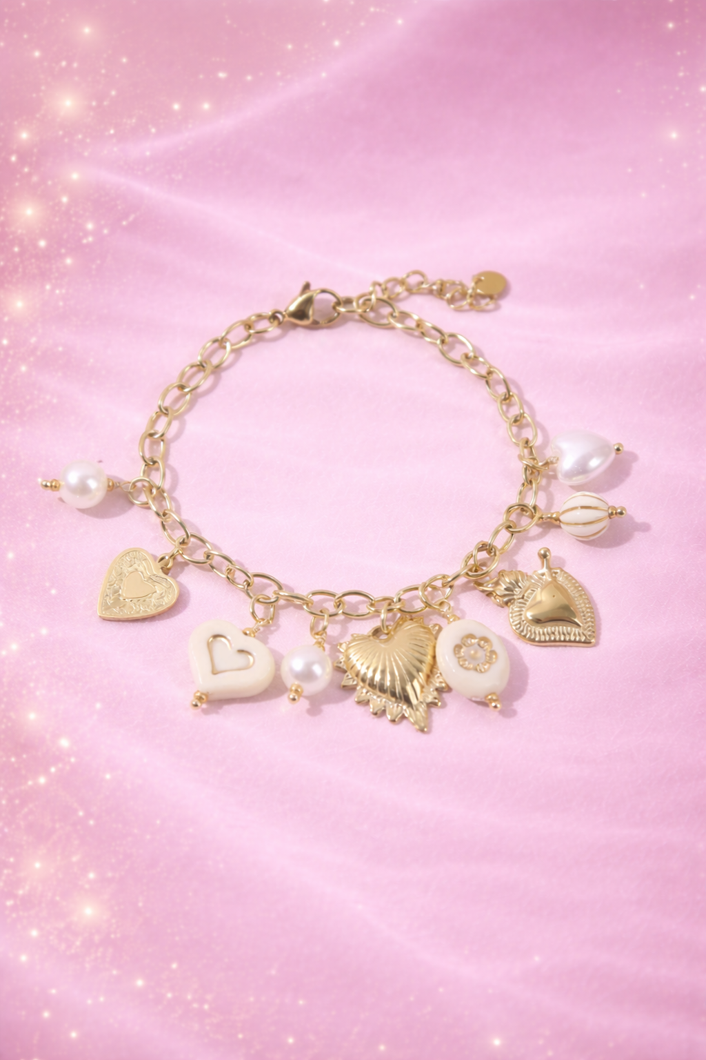 Les pendentifs variés – cœurs gravés, détails texturés et perles nacrées – créent un bijou unique, à la fois moderne et intemporel.