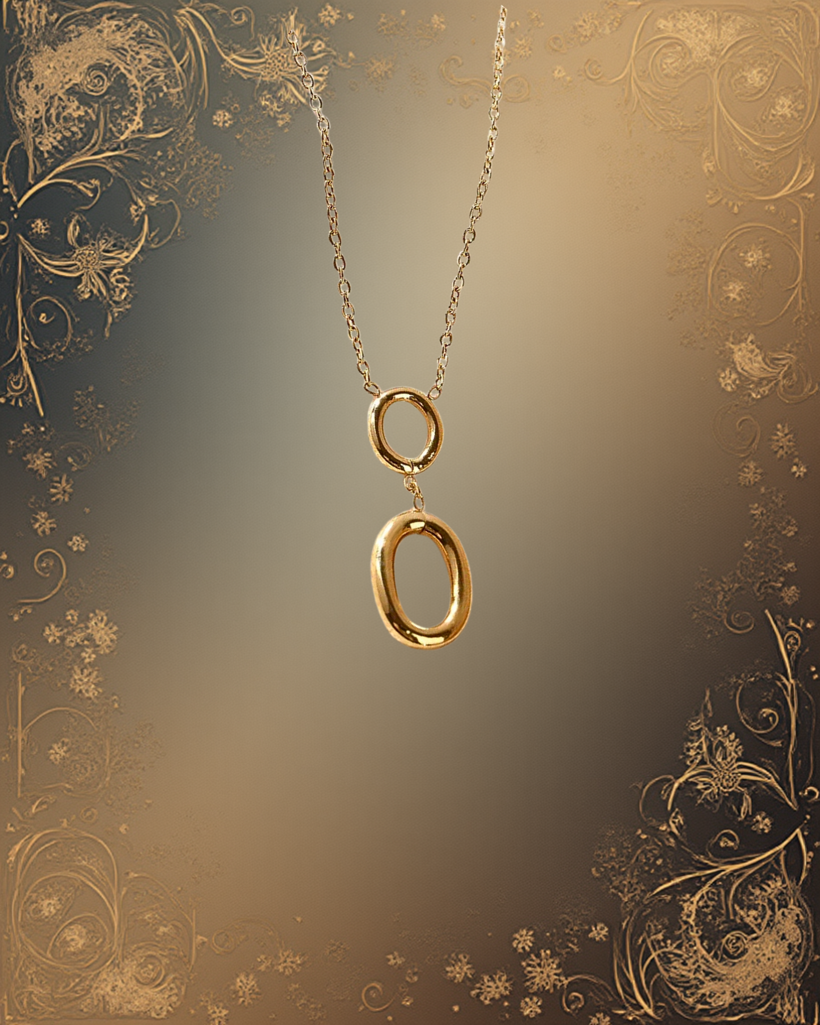 Un collier doré d’une finesse remarquable, composé d’une chaîne délicate et lumineuse. Au centre, deux anneaux ovales s’entrelacent :