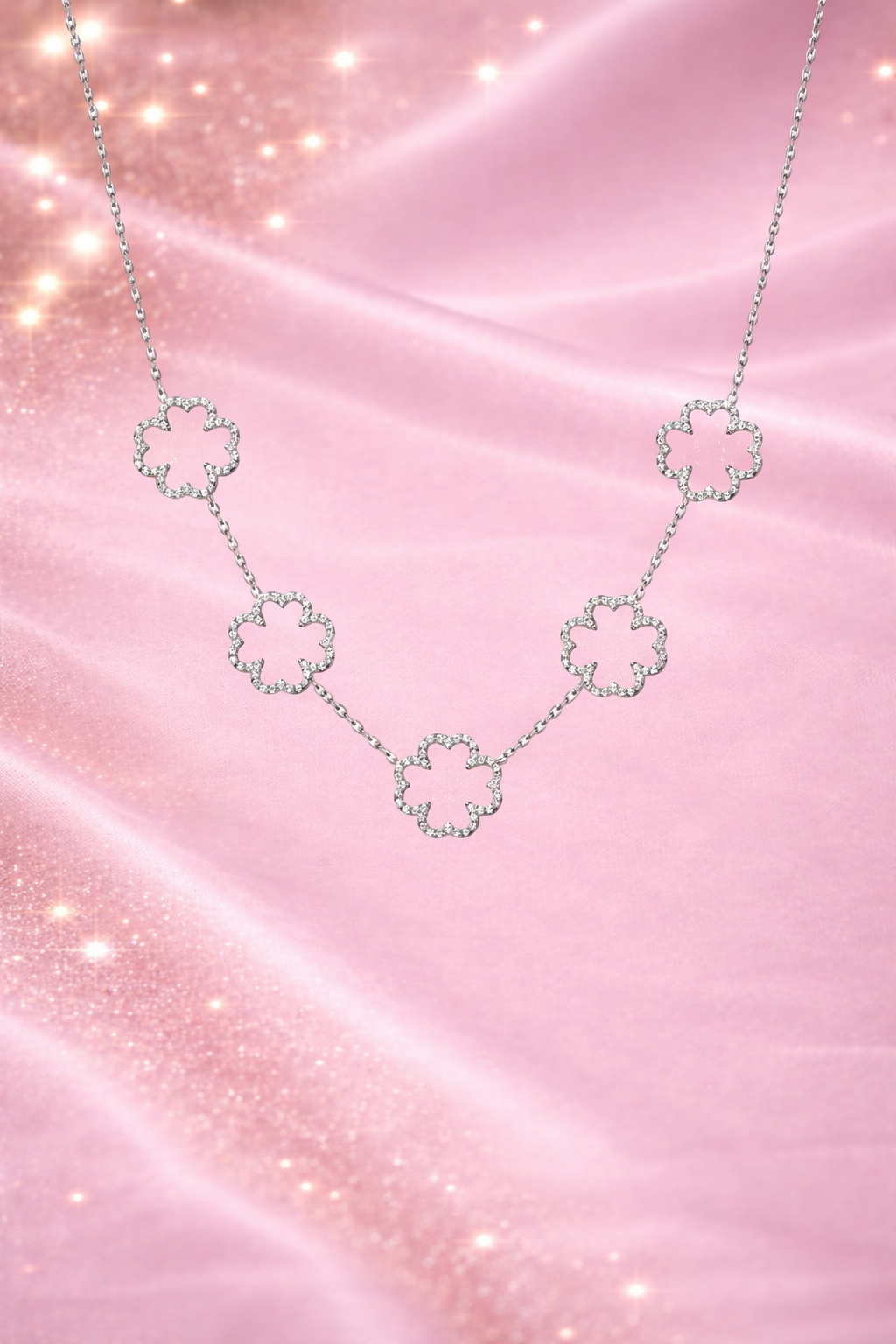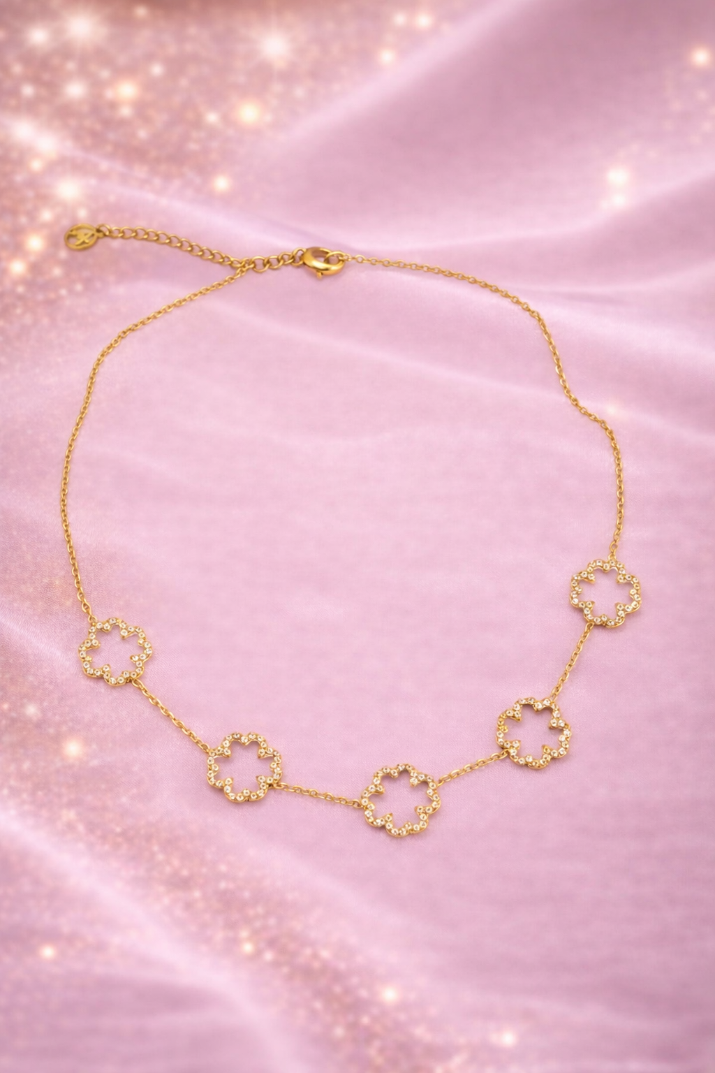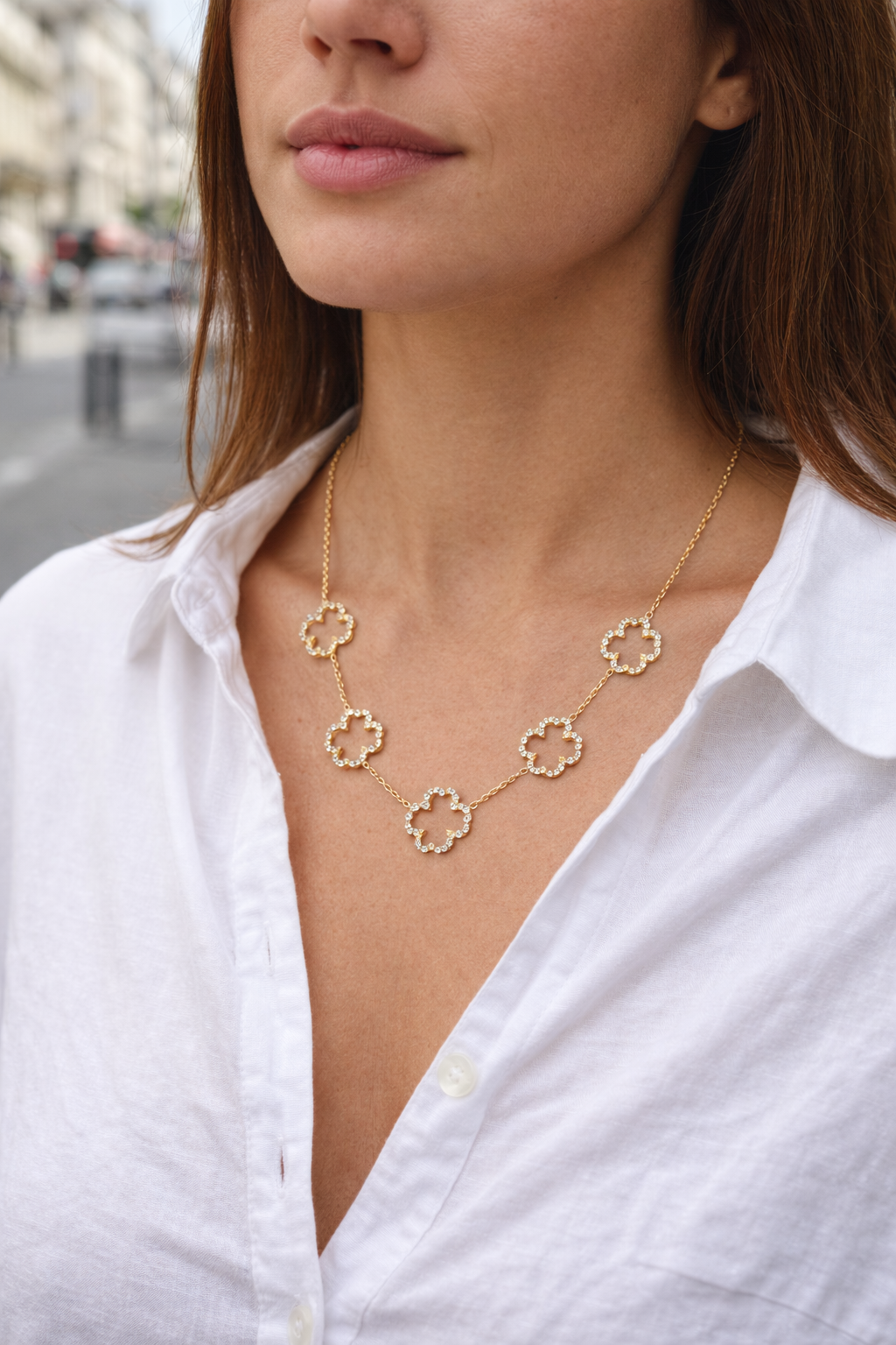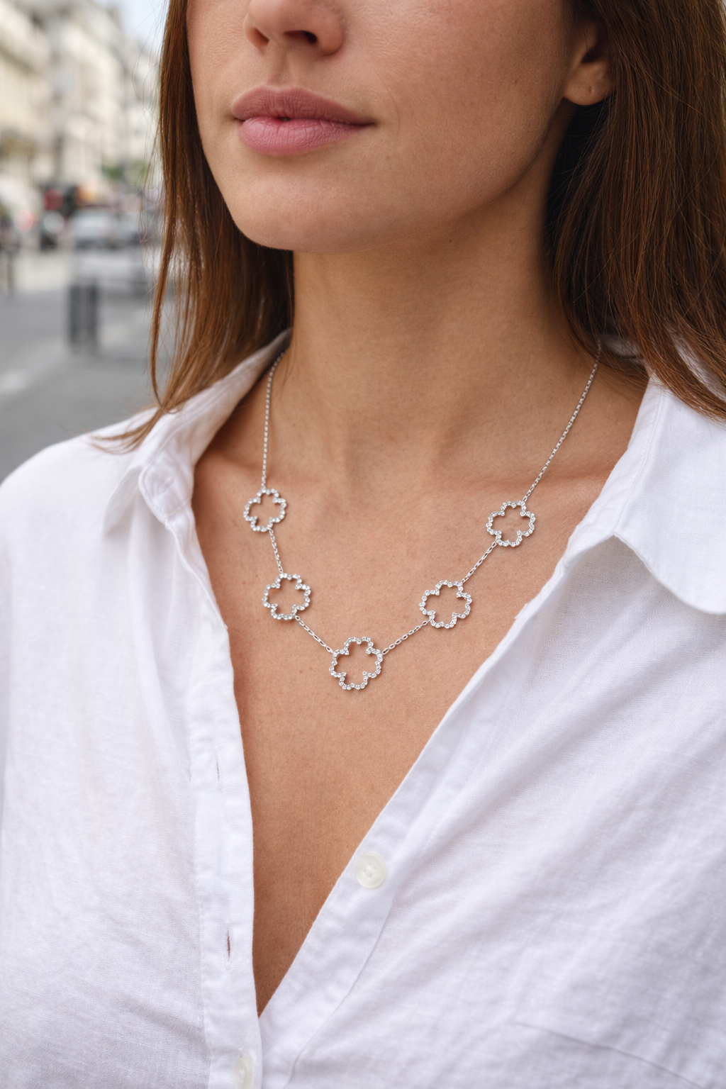 Apportez une touche d’élégance intemporelle à votre style avec ce collier délicatement orné de motifs trèfle sertis de diamants scintillants. Symbole de chance et de raffinement, ce bijou sublime le décolleté avec finesse et modernité.