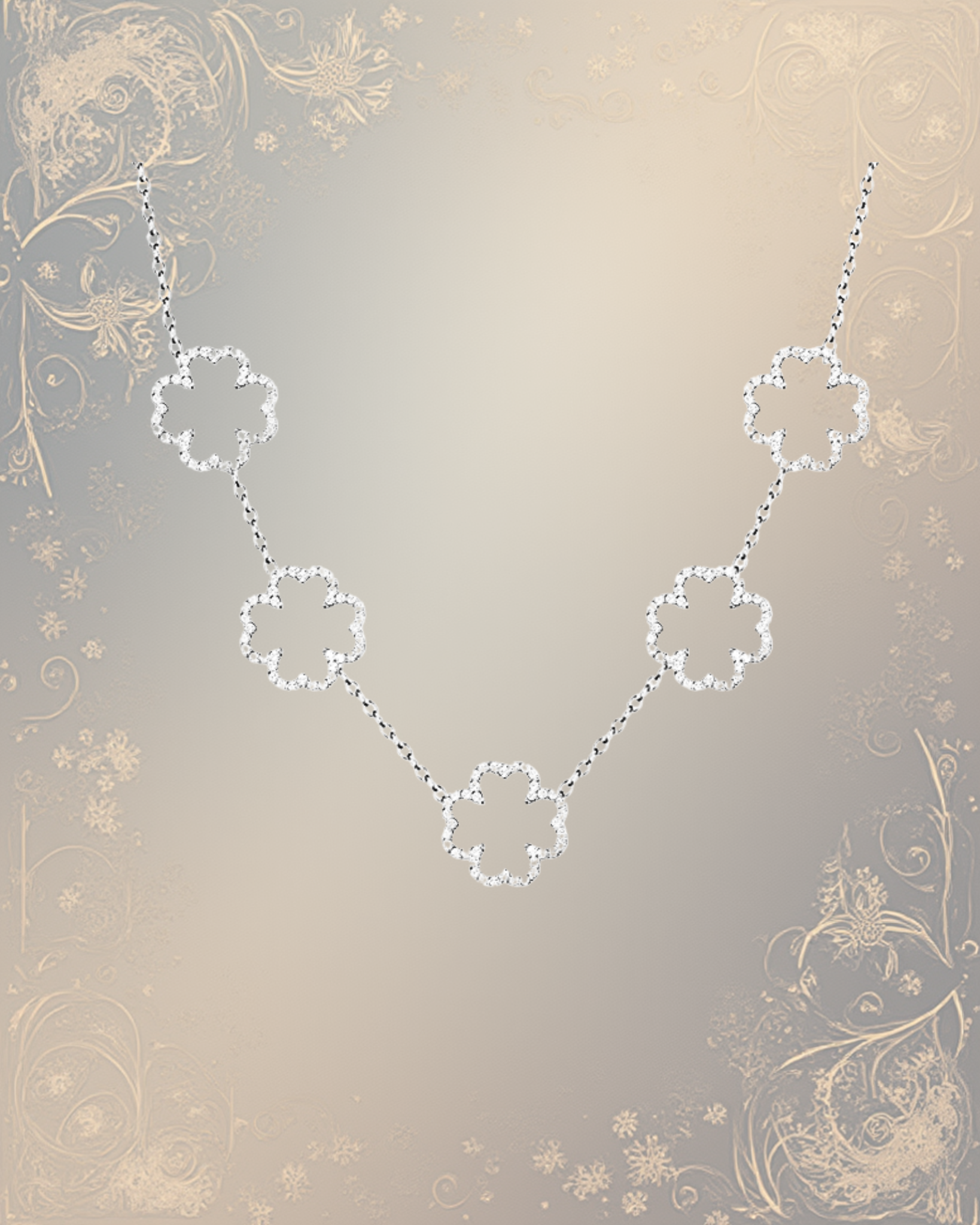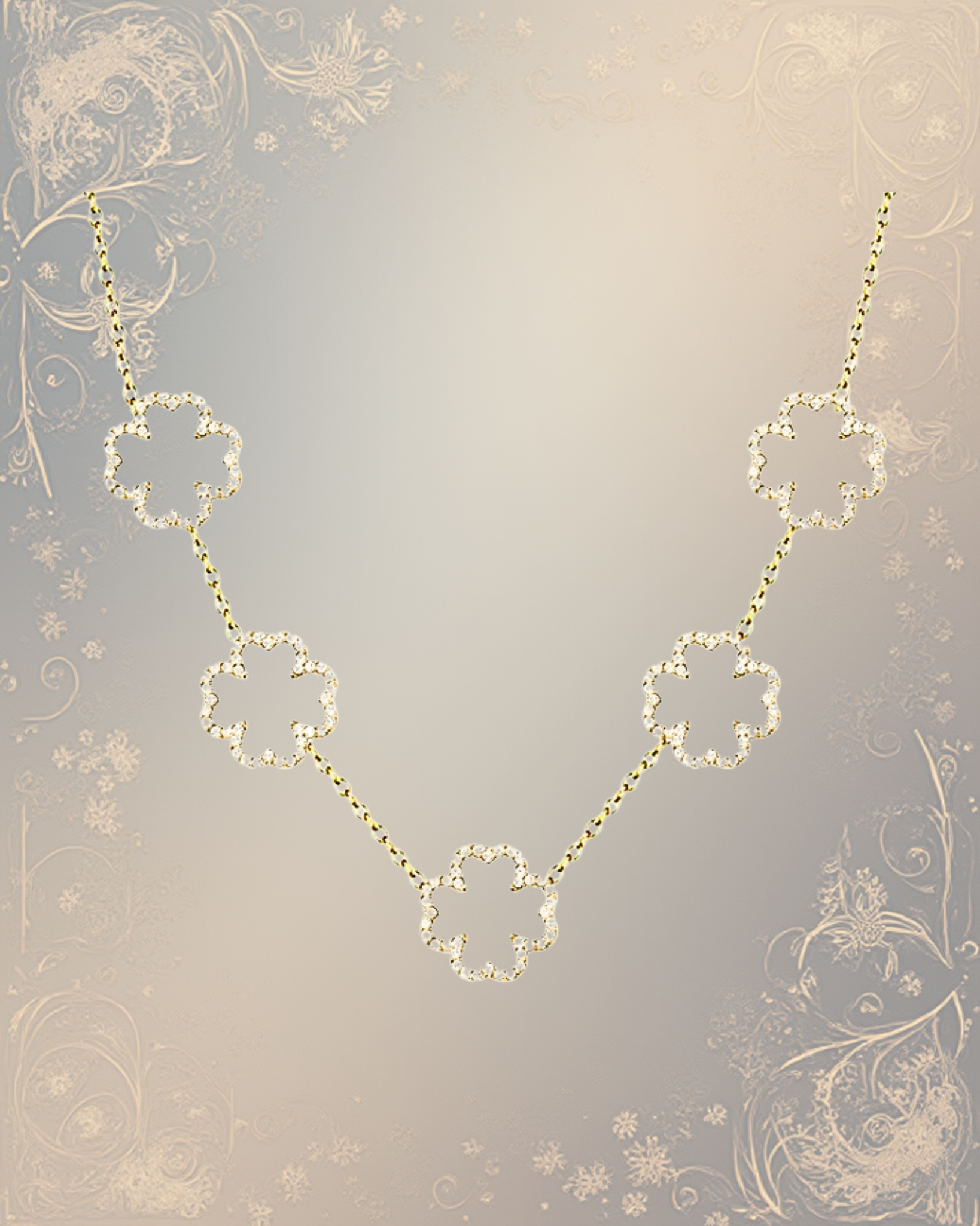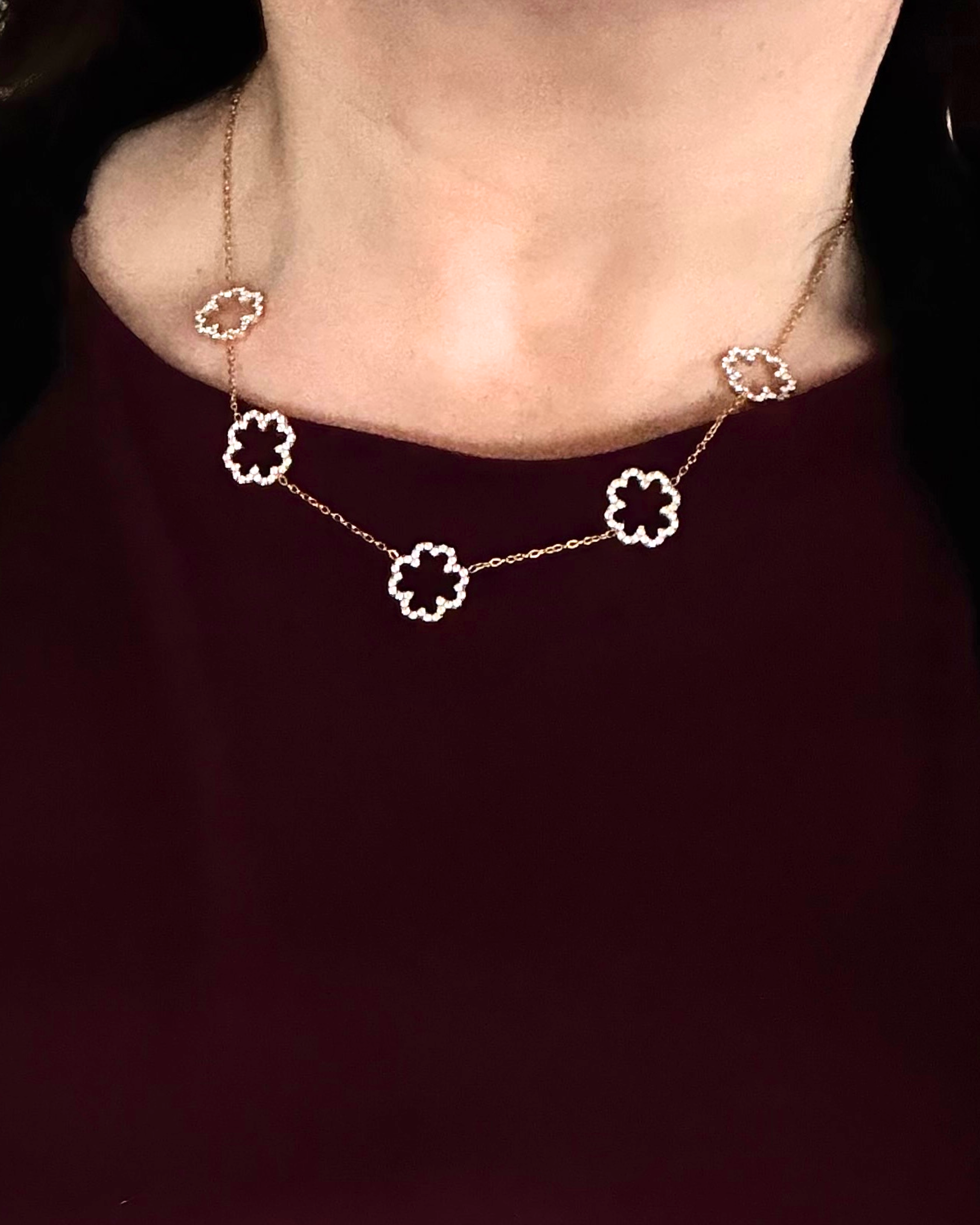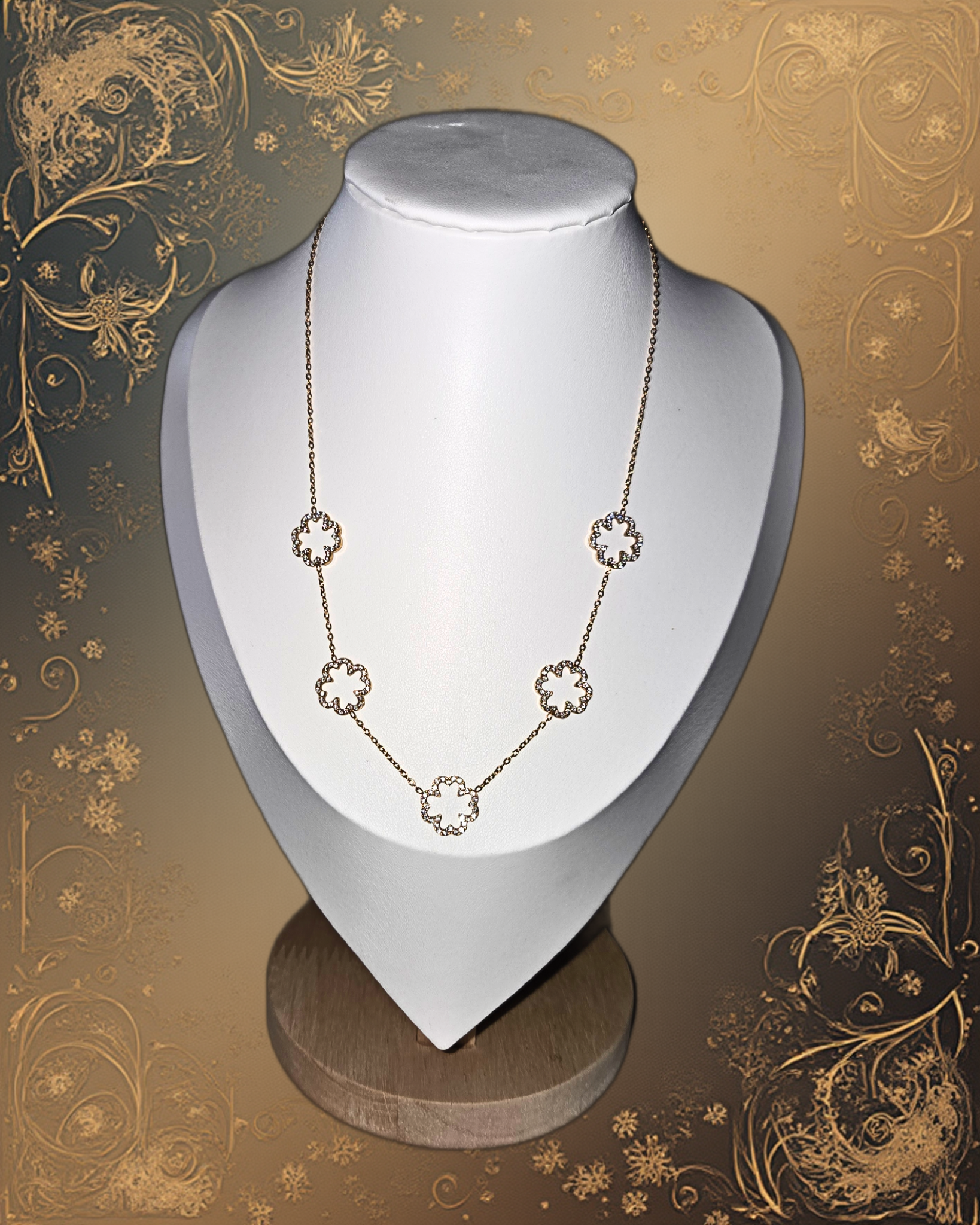 Un collier doré ponctué de fleurs scintillantes. “Fleur Royale” célèbre la féminité majestueuse, la grâce affirmée et l’élégance intemporelle.