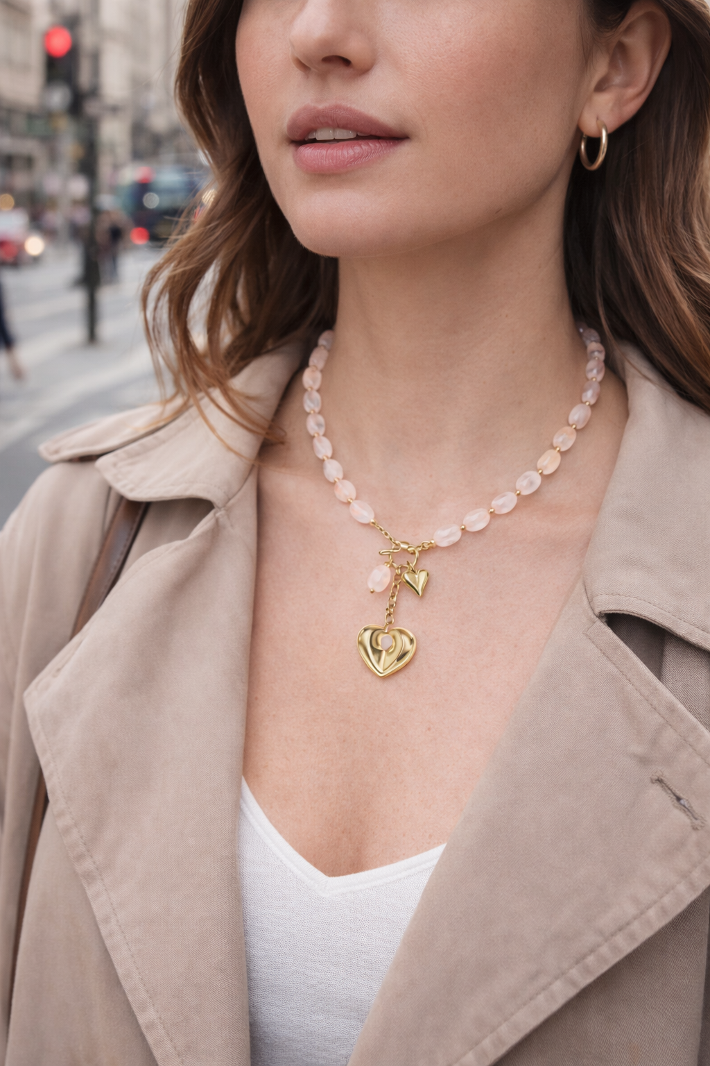 Ses perles aux nuances naturelles évoquent la féminité et la sérénité, tandis que le double pendentif cœur ajoute une dimension romantique et moderne.