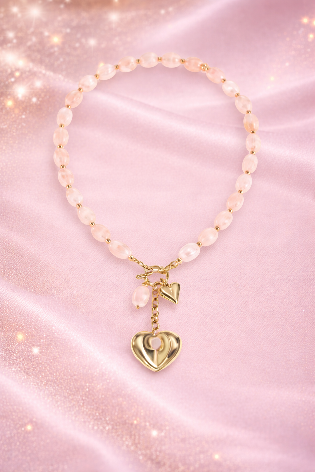 Apportez une touche de douceur et d’élégance à votre style avec ce magnifique collier en perles roses, sublimé par un pendentif cœur doré délicat.