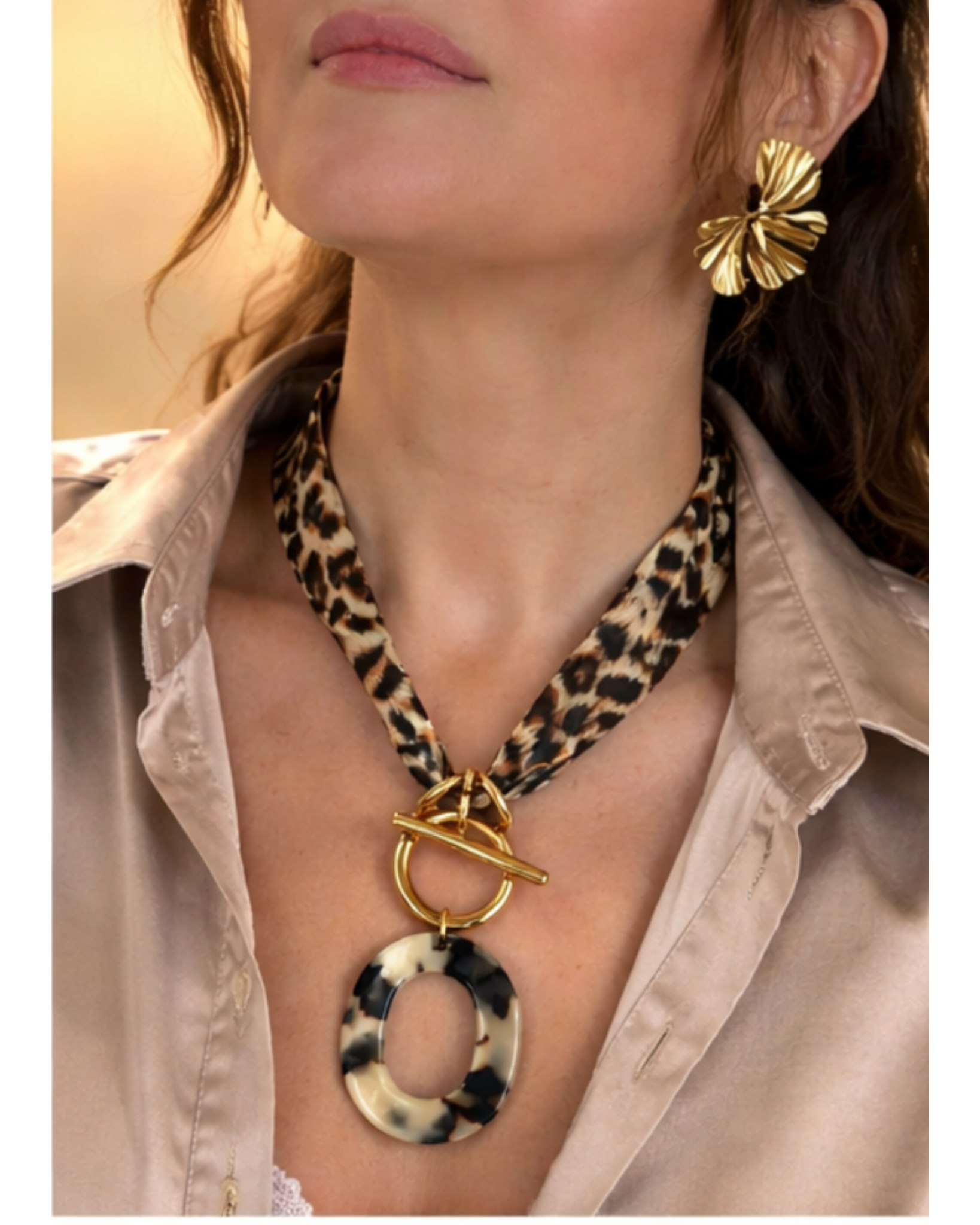 Ce collier foulard léopard est la pièce parfaite pour sublimer vos tenues avec élégance et caractère.
