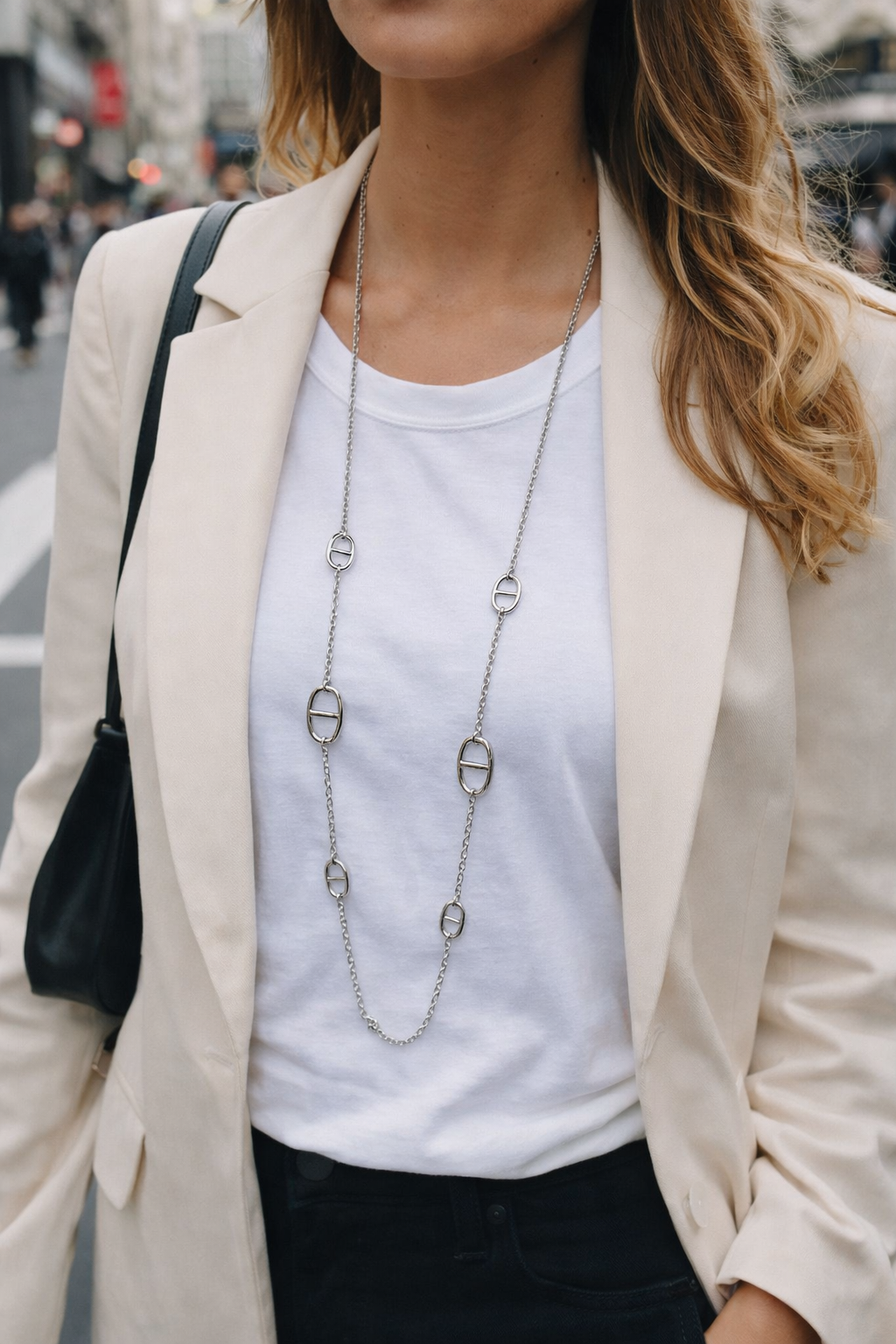 Facile à associer, il sublime aussi bien une tenue casual qu’un look professionnel. Sa longueur allonge visuellement la silhouette et met en valeur le décolleté avec subtilité.