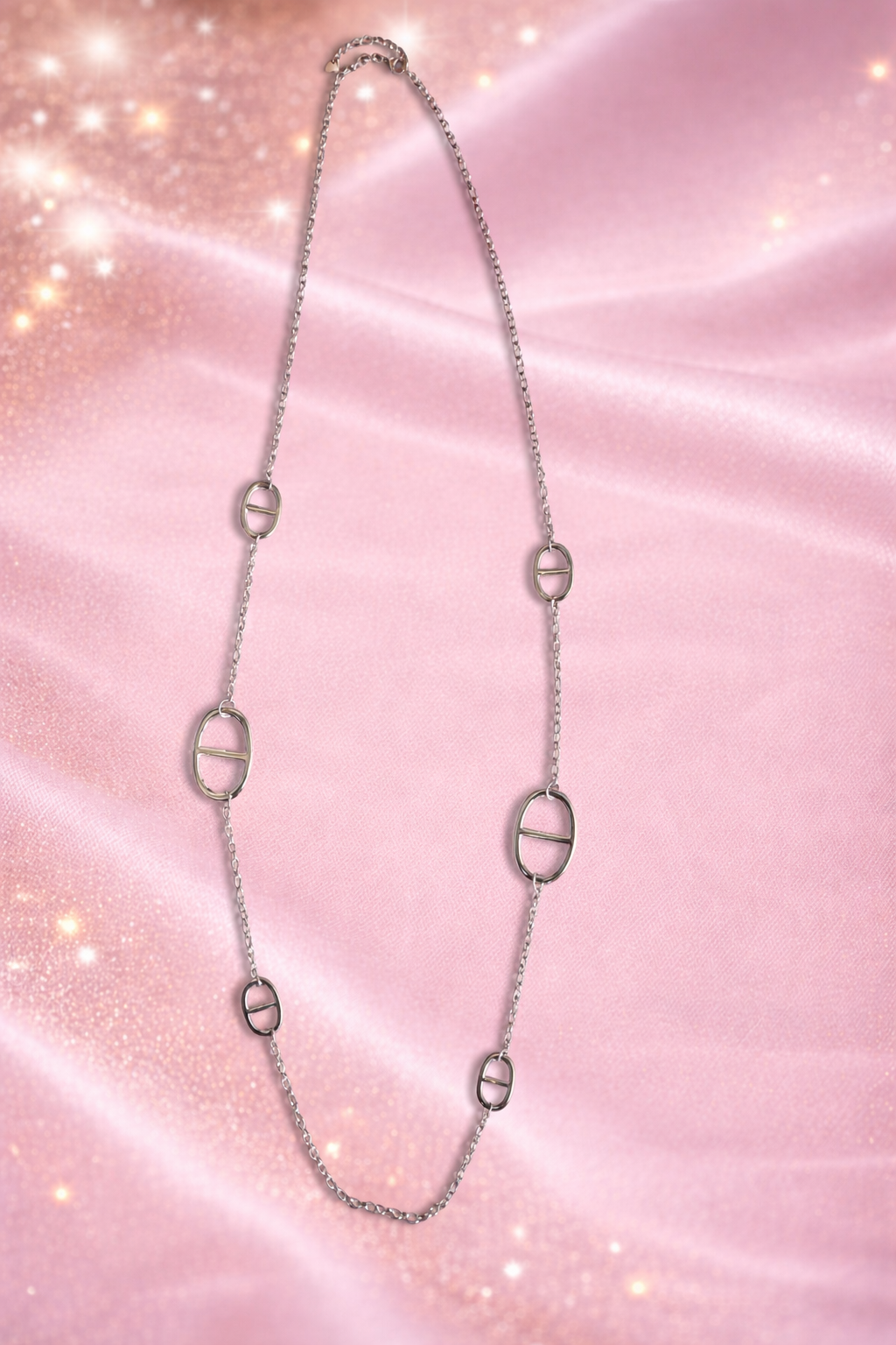 Apportez une touche d’élégance moderne à votre tenue avec ce collier long en argent au design minimaliste. Composé de maillons ovales géométriques, ce bijou se distingue par sa finesse et son style contemporain.