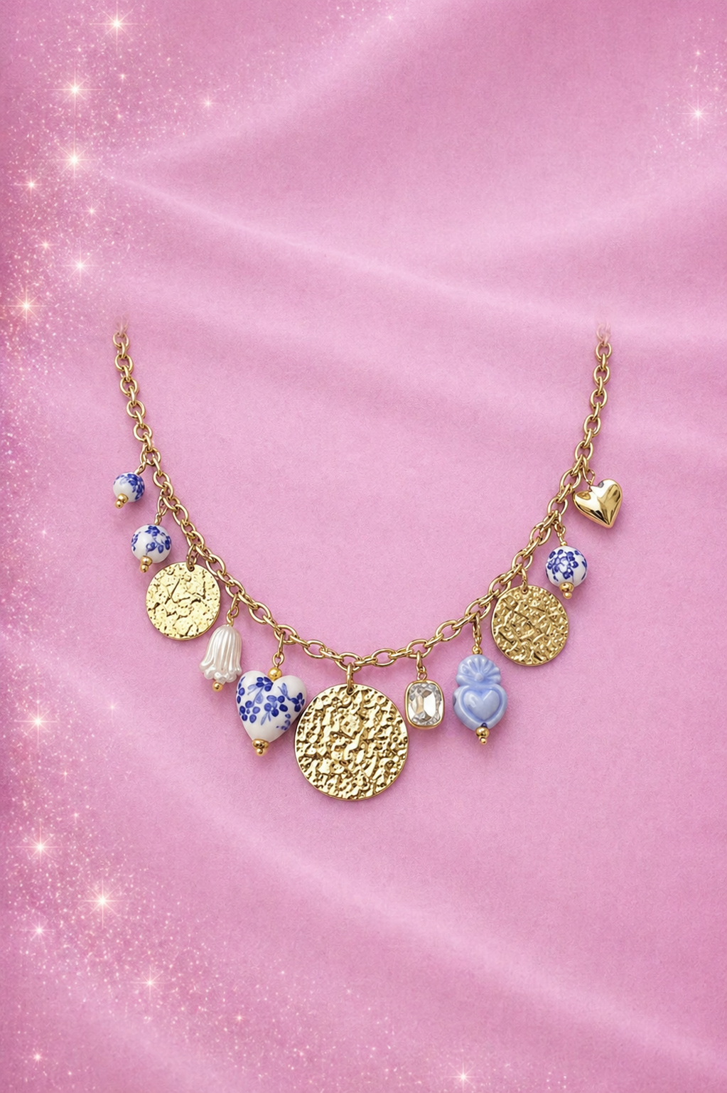 Laissez-vous séduire par le Collier Trésors Romantiques Dorés, un bijou délicat qui allie charme, élégance et modernité. Composé de multiples breloques raffinées – médailles texturées, cœurs, perles et détails scintillants – il sublime votre décolleté avec finesse.