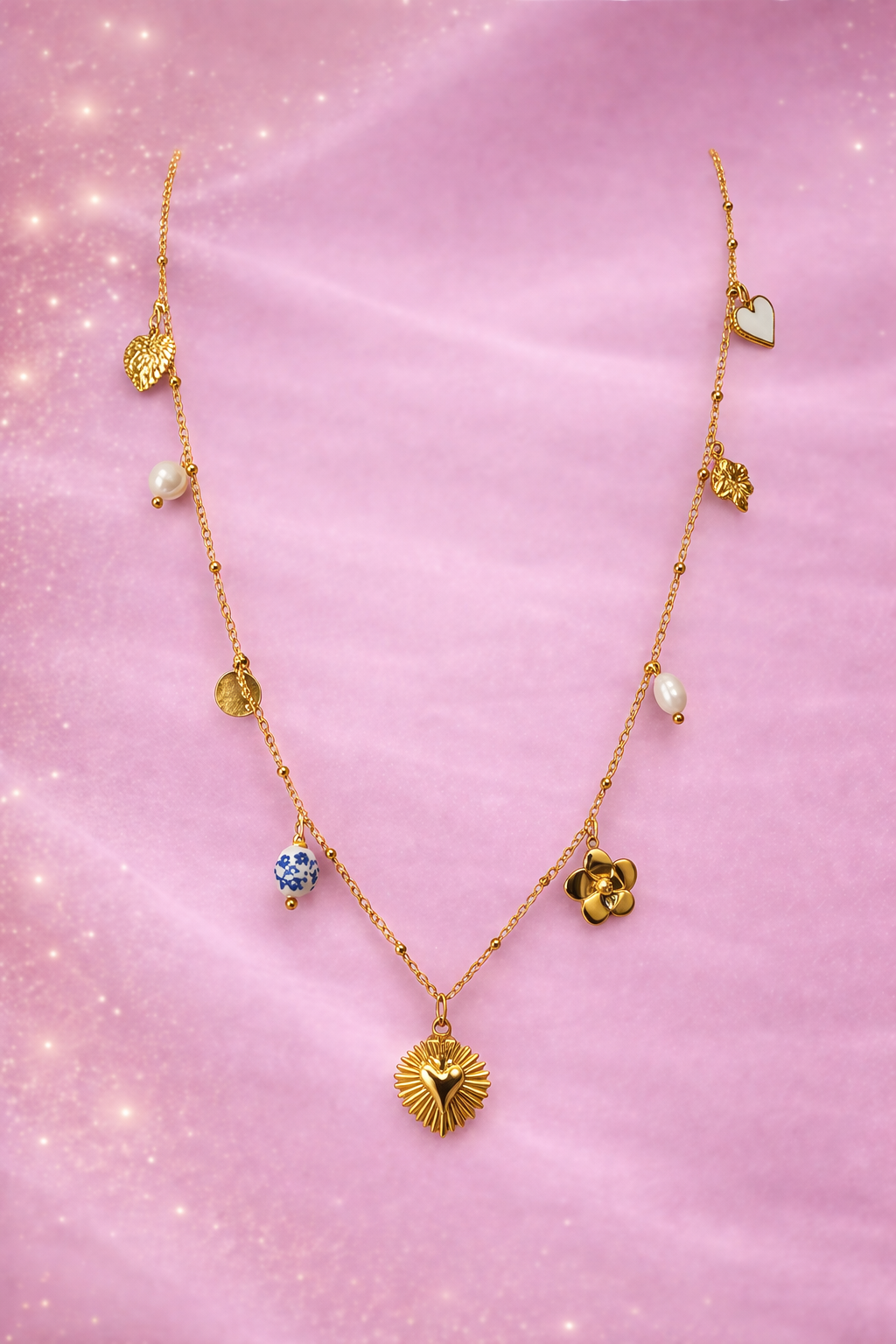 Laissez-vous séduire par ce collier doré fin, sublimé par des charms délicats : cœur, fleur et perles élégantes. Son design asymétrique et léger apporte une touche moderne et raffinée à votre style.