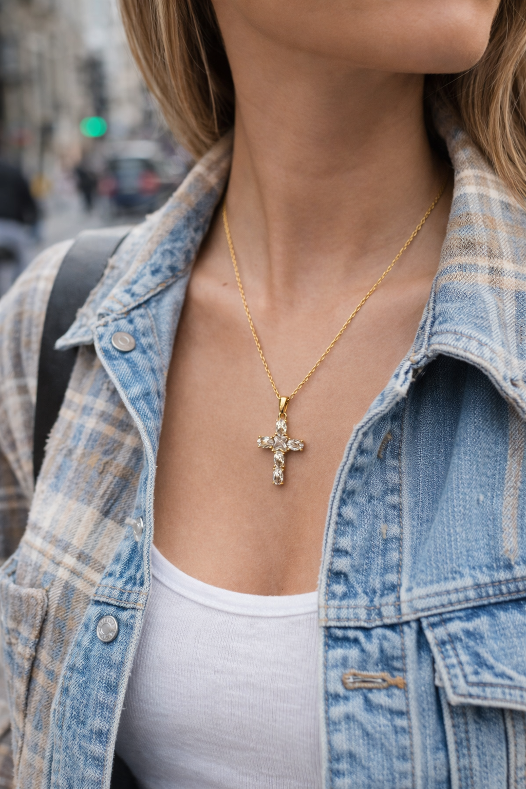 Apportez une touche d’élégance à votre style avec ce collier croix doré pour femme, orné de pierres scintillantes. Parfait pour un look street chic ou une tenue quotidienne, ce bijou allie modernité et raffinement. Léger, tendance et intemporel, il sublime votre décolleté en toute occasion.