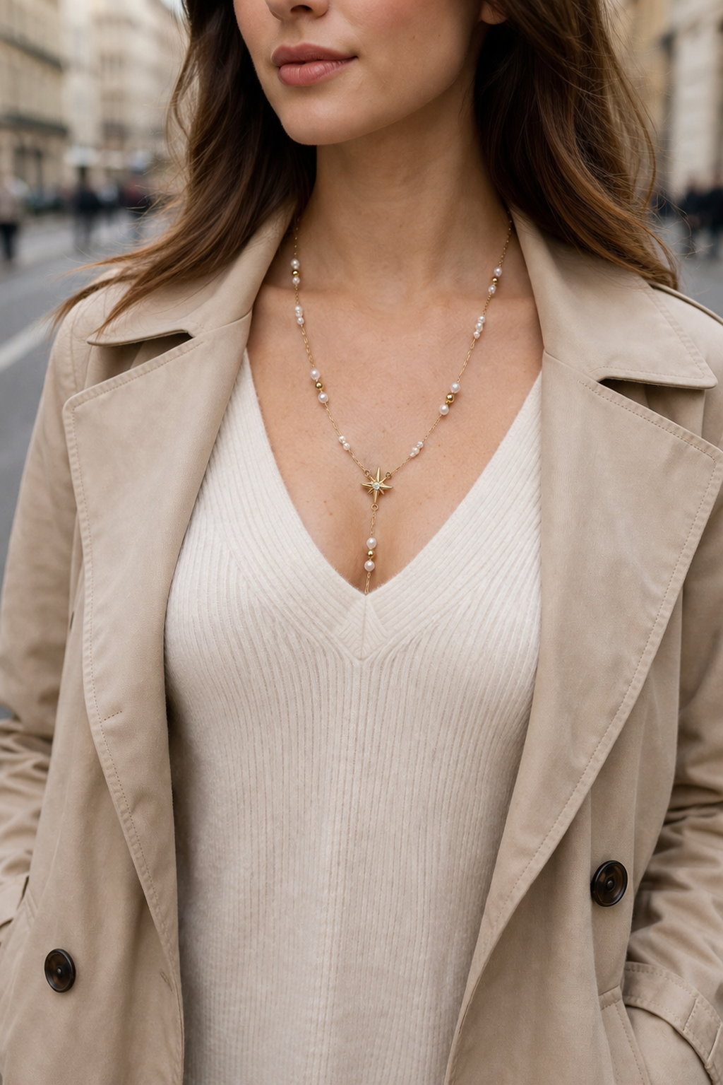 Ce collier lariat se distingue par sa chaîne fine et raffinée, agrémentée de petites perles blanches et de perles dorées subtilement espacées. Au centre, une étoile à 8 branches avec zirconium capte la lumière, tandis qu’une seconde étoile pend en délicatesse au bout du collier, reliée par une chaîne ornée de perles.