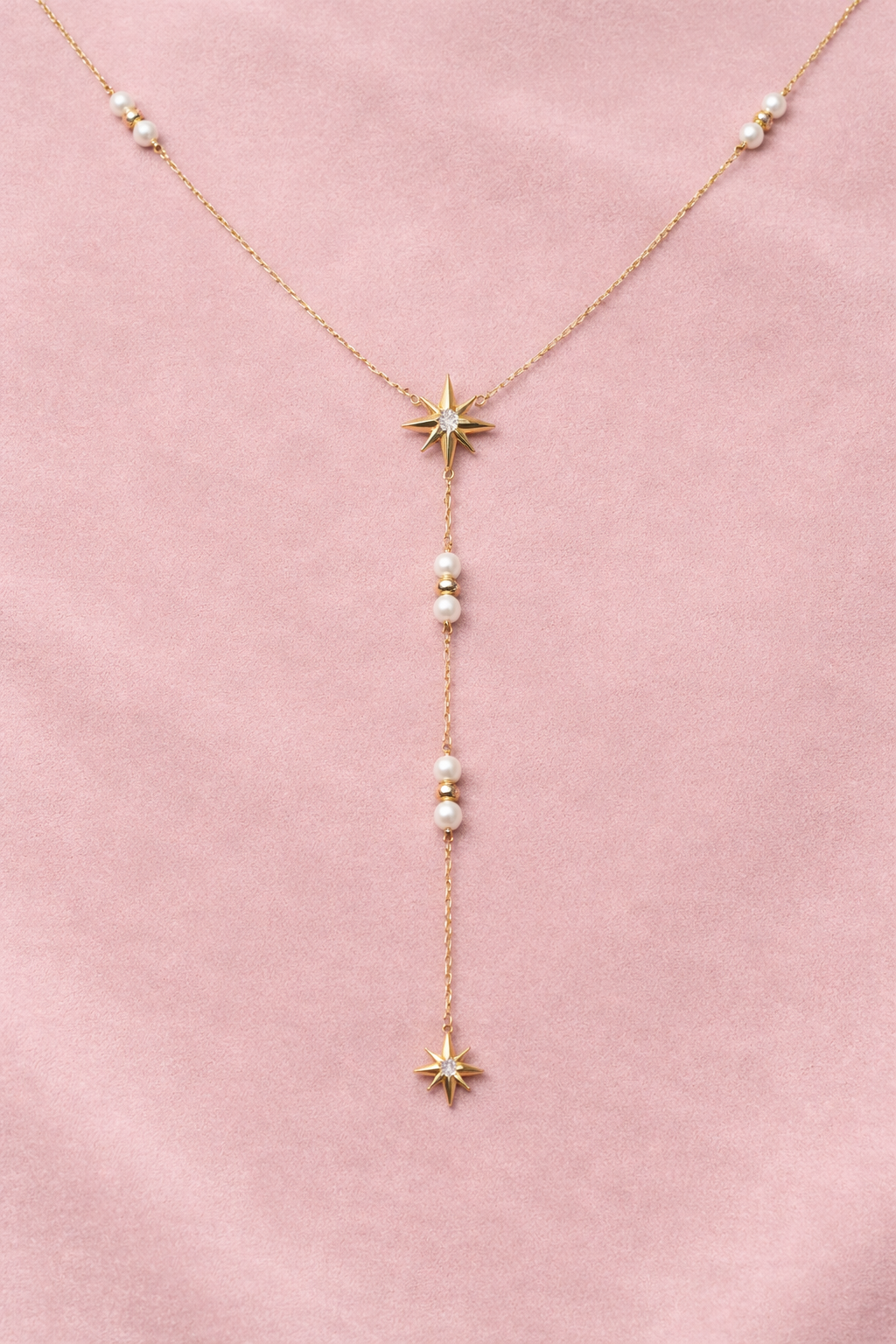 Apporte une touche céleste et élégante à ton style avec ce magnifique collier Y doré orné de perles délicates et d’étoiles scintillantes.